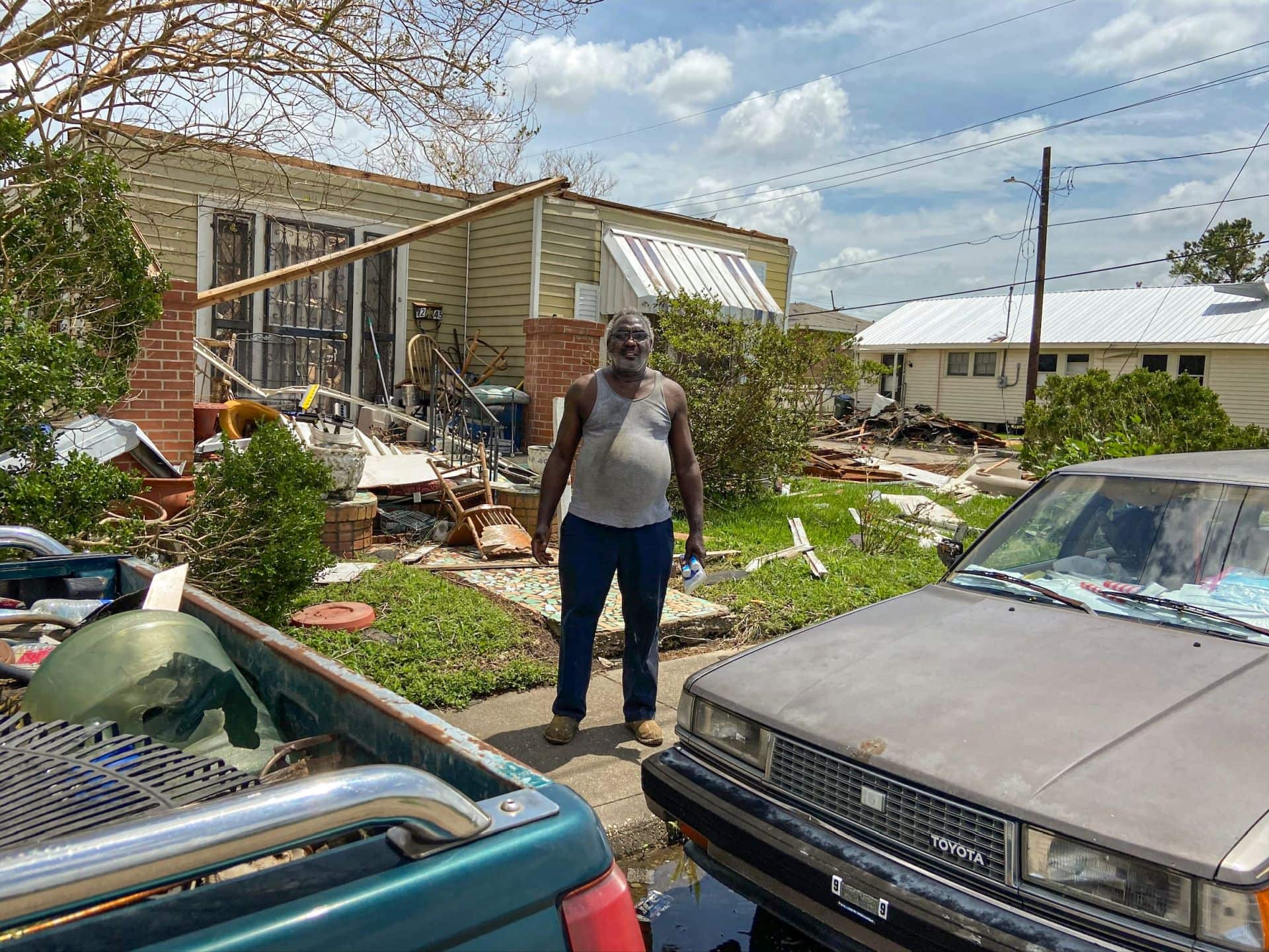 Sylvester “Sly” Smith Jr., a long-time resident of Houma, Louisiana, stands in front of his damaged home caused by Hurricane Ida. Mr. Smith has witnessed many storms pull through but none as strong as Ida. With no shelters available, he was living out of his car with a 30-day supply of necessary medications for his high blood pressure when aid began to arrive. (Photo/Americares)