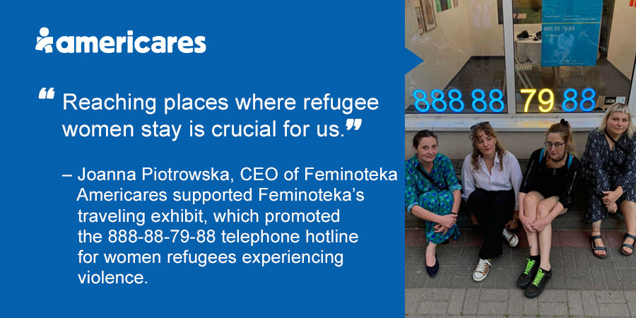 Displaced women and refugees from Ukraine and other war-affected areas are particularly vulnerable to physical and sexual violence. Feminoteka, an Americares partner in Poland, raises awareness about violence against women and provides counseling and resources to survivors. With support from Americares, Feminoteka created a traveling exhibit promoting its helpline for women fleeing Ukraine.