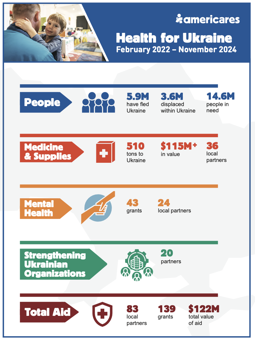 Americares has a long history of supporting clinical services for refugees and migrants. In the past 10 years alone, Americares has provided more than $70 million in aid to support health care for refugees and migrants in over a dozen countries including supporting health services for families fleeing the humanitarian crises in Syria and Venezuela. Since 1986, Americares has provided more than $2 billion in aid to Eastern Europe, including more than $262 million in aid to Ukraine, which began in 1992. We also donate medicines and medical supplies to U.S.-based medical professionals traveling to Ukraine to provide care for patients in need.