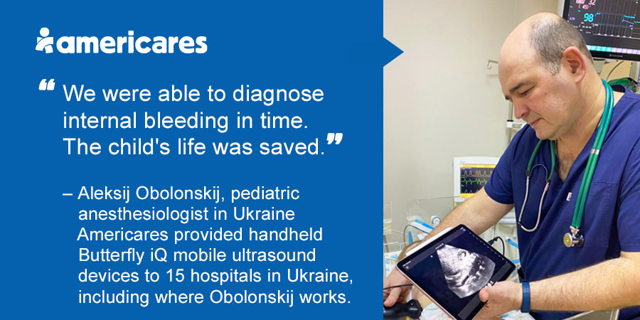 Ultrasound imaging is a critical diagnostic tool for doctors and first responders, especially in Ukraine, where deadly bombs cause injuries far too often. In one instance, through the Institute of Emergency Medicine in Poland, Americares provided handheld Butterfly iQ ultrasound probes to 15 hospitals in Ukraine, including the regional hospital where pediatric anesthesiologist Aleksji Obolonskij works, saving the lives of young trauma patients.