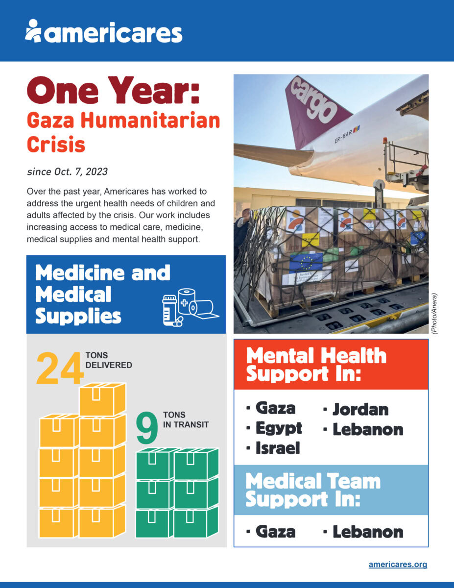 We are working with partner organizations with staff on the ground in Gaza to increase access to medicine, medical supplies and mental health support for frontline health care providers and survivors. Over the past year, we have delivered 24 tons of medicines and supplies and provided $550,000 in funding for medical teams providing essential health care services in Gaza, which has no fully functioning hospitals.